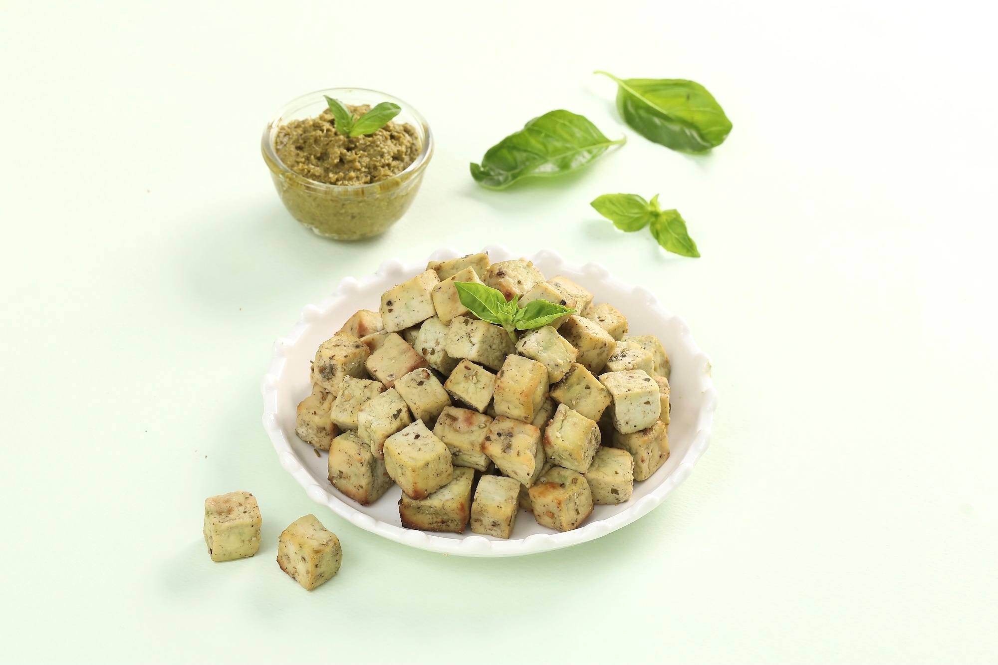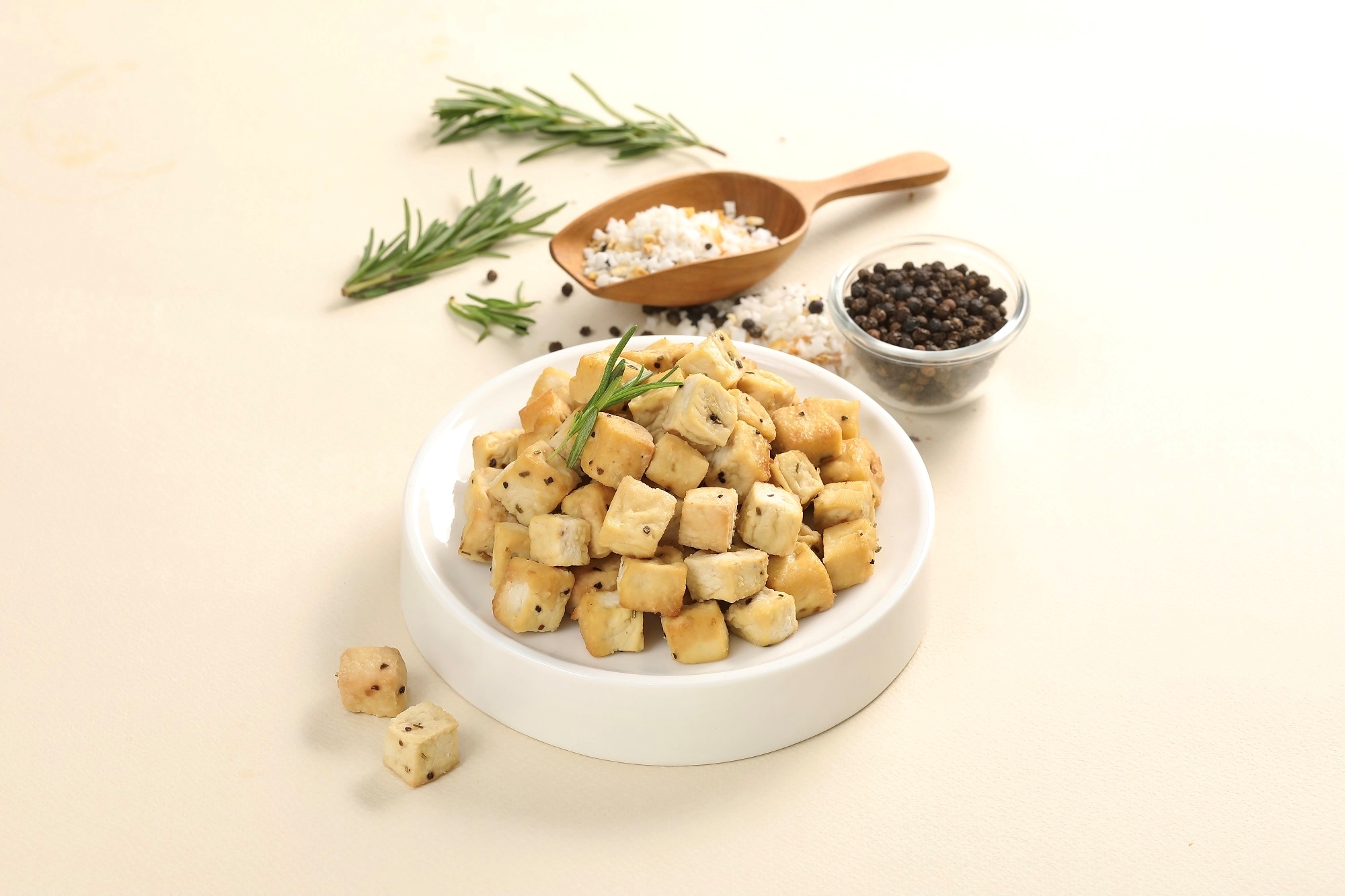로즈마리와 바질을 곁들여 한 입에 먹기 좋은 식물성 고단백질 두부 제품 2종